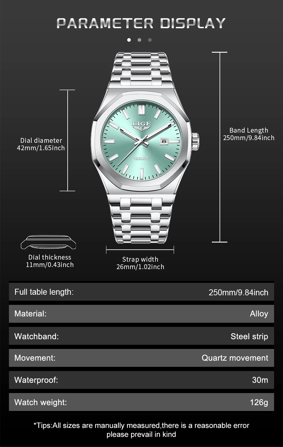 LIGE Watch For Men Original Top Brand Luminous Date Stainless Steel Men's Watches Business Waterproof Japan Movement Wristwatch